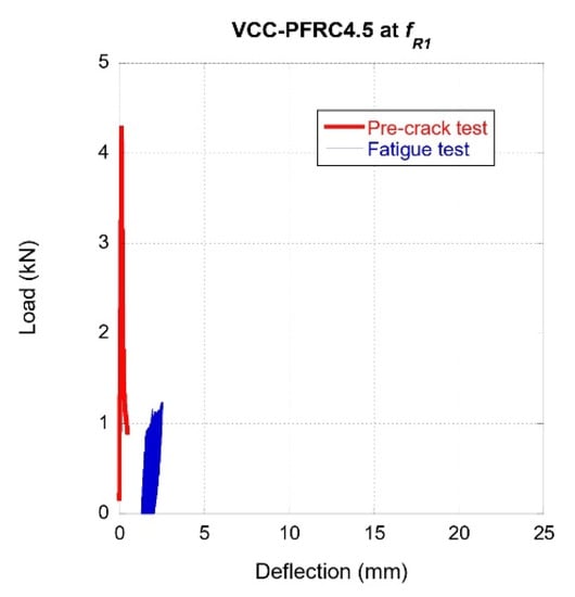 VCC-PFRC4.5 specimens were subjected to fatigue tests after carrying out a pre-crack that corresponded to a SLS (fR1, which corresponded to a crack width of 0.5 mm). The results of such tests can be observed in Figure 8. The characteristics of the load cycles were quite similar to the ones applied to the SCC-SFRC50 specimens. However, the specimens manufactured with VCC-PFRC4.5 were able to withstand up to 1,000,000 cycles without collapsing or suffering remarkable damage. Reaching 1,000,000 cycles without collapsing was considered the endurance of the material. As can be seen in Figure 8, although a certain increment of the deflection is perceived, its values remained in within the limits established for calculating the ULS. In addition, no remarkable changes in the stiffness of the material can be noticed.