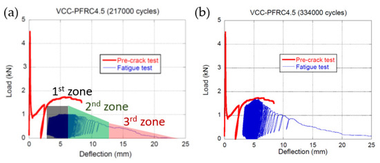 Fatigue behaviour of VCC-PFRC4.5 specimens pre-cracked at fR3: (a) specimen collapsed after approximately 217,000 cycles and (b) specimen collapsed after approximately 334,000 cycles.