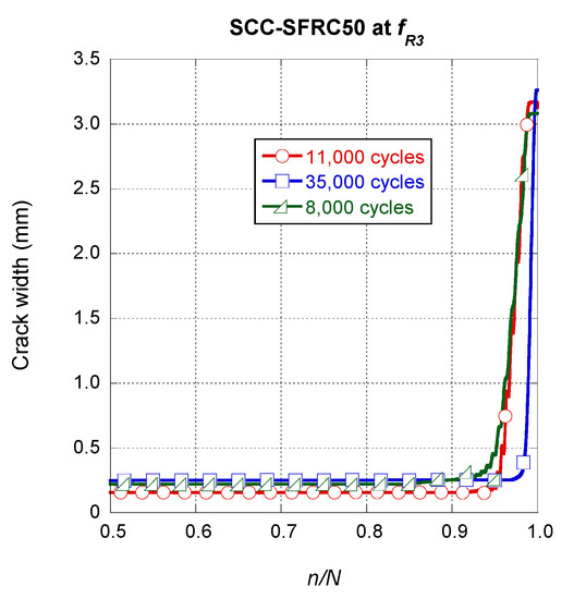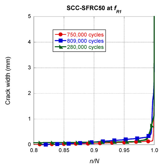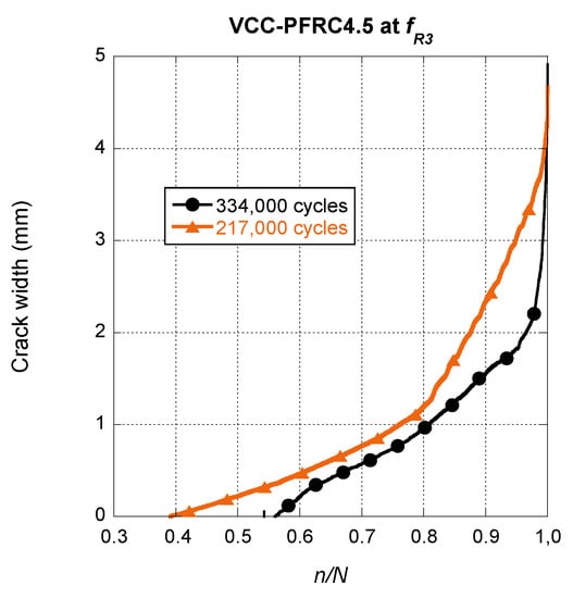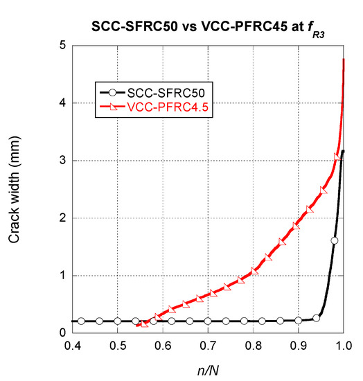 Observing Figure 12, it should be mentioned that the shape that displayed any of the crack width evolution curves of VCC-PFRC4.5 was remarkably different from the ones displayed for SCC-SFRC50, both for the fR1 and fR3 cases. The steady growth part of the curve is not clearly noticed and is difficult to detect where the growth of the final fracture appears. This phenomenon can be perceived in the case of the specimen that collapsed at 217,000 cycles, being not so evident in the case of the other specimen. Another point that is worth to mention is that the onset of the steady growth phase was between a n/N value of 0.4 and 0.55.