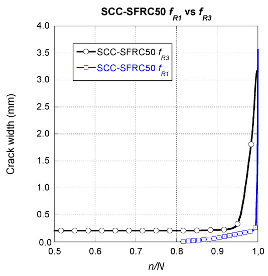 In order to determine the influence of the pre-crack width in the residual fatigue load-bearing capacity of SCC-SFRC50, a comparison of the average curves shown in Figure 10 and Figure 11 was carried out. Such curves can be seen in Figure 13. It can be seen that in the case of the specimens pre-cracked at fR1 the growth of the crack width is remarkably steadier than in the case of the specimens pre-cracked at fR3. This is of a great importance because it supposes that when ULS is reached in a structural member without any other reinforcement the propagation of damage if fatigue cycles are introduced is sudden and develops rapidly. On the contrary, when SLS is applied in a SCC-SFRC50 structural element and later fatigue cycles are applied, the crack growth onsets right after 80% of the endurance of the material is surpassed. Moreover, the crack growth is progressive almost until the total endurance of the material is reached.