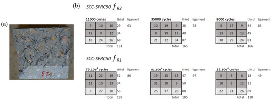 The scattering in the fatigue tests was studied for both formulations in which specimens collapsed. In the case of SCC-SFRC50 specimens that had been pre-cracked at fR1, we observed a great discrepancy in one of the three tests conducted. In such a test, only 280,000 cycles could be performed, whereas in the other two, around 800,000 were achieved. In order to analyse the potential differences in the cracking process among the specimens tested, Figure 10 was performed. Moreover, a counting exercise was carried out to detect if there was any relation between the number of fibres in the fracture surfaces and the number of cycles that the specimens were able to sustain.