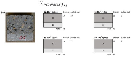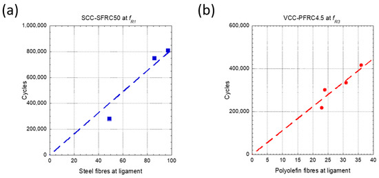 As can be seen in Figure 17b, there was a linear relation between the number of fibres in the ligament of the VCC-PFRC4.5 specimens pre-cracked at fR3 and the cycles that such specimens could bear before collapsing. In the case of the specimens of such formulation pre-cracked at fR1, no relation could be established as the fatigue tests ended when reaching 1,000,000 cycles The discrepancies in the behavior of SCC-SRFC50 and VCC-PFRC4.5 could be attributed to the different mechanical properties of the fibers and fiber-matrix anchorage mechanisms. Consequently, while the polyolefin fibers were capable of changing the FRC behavior both at fR1 and fR3, steel fiber seemed to be more relevant at fR1.