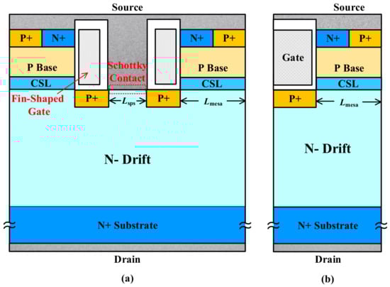 Sentaurus-2018 Technology Computer-aided Design (TCAD) simulators from American Synopsys Inc. are applied to investigate the electrical characteristics of the devices. The cross-section views of FS-TMOS and conventional trench MOSFET (C-TMOS) are illustrated in Figure 1a,b, respectively. Compared with the C-TMOS, there are two proposed structure components: (1) fin-shape and (2) integrated Schottky contact. The fin-shaped gate located on the sidewall of trench is utilized to reduce Miller charge, and the Schottky contact introduced in the trench bottom region between adjacent fin-shaped gate aims to improve the third quadrant performance avoiding bipolar degradation from the P- base region/N drift region formed junction operation. Moreover, the split P shield (SPS) located on the two sides of the trench bottom is introduced under the fin-shaped gate. The SPS in the FS-TMOS facilitates two main functions: (1) One is to protect trench gate oxide from excessive electric field and (2) another is to suppress the electric field of Schottky contact interface, which are of significance to long-term reliability in the OFF-state. No matter the SPS and the conventional P shield, the introduced JFET effect severely degenerates Ron,sp. Hence, the current spreading layer (CSL) is adopted to solve the aforementioned contradiction.