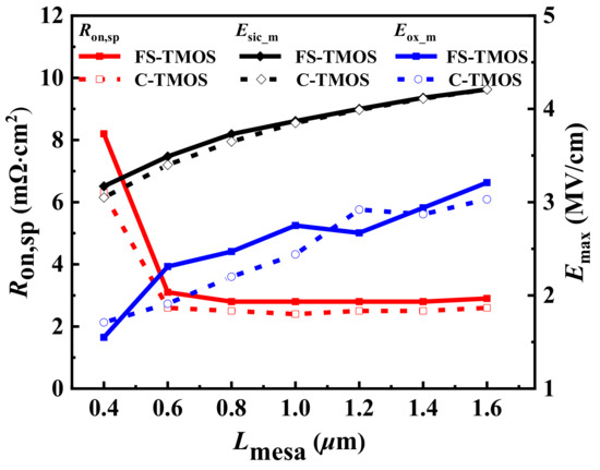 Eox_m and Esic_m (when the drain-source voltage Vds = 1200 V) and Ron,sp dependent on Lmesa.