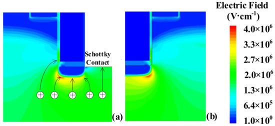 The influence of mesa width Lmesa on maximum electric field of trench gate SiO2 Eox_m and SiC Esic_m and Ron,sp is illustrated in Figure 2. Due to relatively lower channel density of the FS-TMOS, the Ron,sp of FS-TMOS is greater than that of C-TMOS. When the Lmesa is lower than 0.6 μm, the Ron,sp of the two TMOS increases evidently as a result of the JFET pinch-off effect. Whereas the Lmesa is larger than 1.6 μm, the punch-through effect happens at the P Base region. Because the introduced P shield is able to alleviate the electric field crowding effect around trench corner and bottom, the Eox_m is expected to be much lower than the long-time reliability concern value 3~4 MV/cm. Apart from screening trench gate oxide from electric field crowding, the SPS plays another important role by absorbing the electric field line, overwhelming the excessive electric field located at the Schottky contact, simultaneously, as shown in Figure 3.