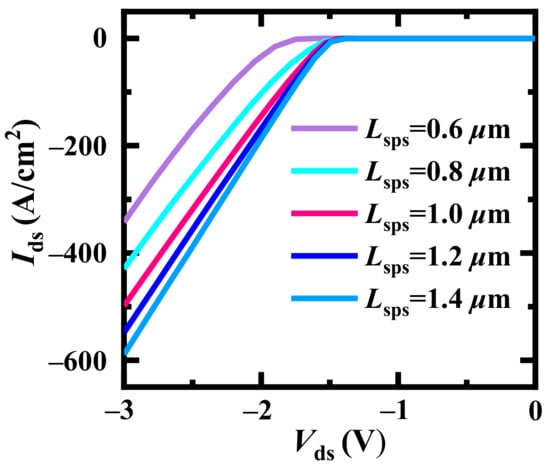 Furthermore, the distance between the two adjacent SPS Lsps influences the third quadrant performance as shown in Figure 5. With wider Lsps, the reverse conduction capability (the drain-source current, Ids) enhances gradually. On the other hand, the turn on voltage (Von) is degraded evidently when Lsps is lower than 0.8 μm. Considering state-of-the-art process technologies for SiC power devices and fundamental capability, the Lmesa and Lsps are optimized to be fixed 1 μm and 1 μm, respectively, in the following discussions.