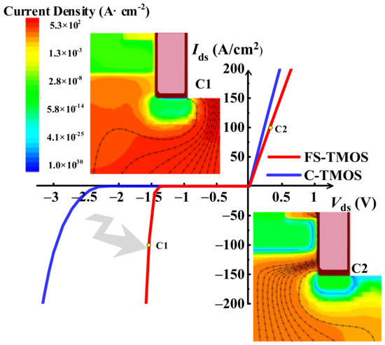 The distribution of current density and the current flowing path inside the FS-TMOS at forward and reverse conductive state (i.e., C1 and C2 point of Figure 6) are depicted in the insets of Figure 5. The reverse current flowing through Schottky contact when Ids is 100 A/cm2 indicates the desirable inactivation of P body/N drift formed diode in reverse conduction operation. The Von of FS-TMOS is reduced to 1.5 V.