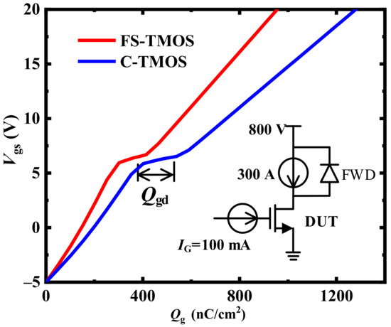 Furthermore, the relationship between charge stored in Ciss (Qg) and Vgs of FS- and C-TMOS is illustrated in Figure 7. The Qg of FS- and C-TMOS are 964 nC/cm2 and 1290 nC/cm2, respectively. The gate-to-drain charge (Qgd) of FS- and C-TMOS are 162 nC/cm2 and 194 nC/cm2, respectively. It shows that the Qg and Qgd of FS-TMOS are significantly reduced by 34% and 20%, compared with C-TMOS.