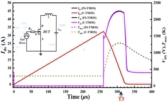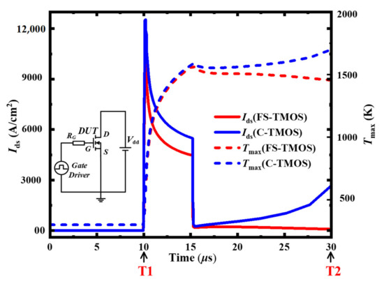 Apart from fundamental performance, the transient extreme stress short circuit and avalanche is also discussed in detail. Electrothermal simulations are carried out to estimate the temperature distribution in the following part. According to the actual package situation, the device is thermally an adiabatic boundary, except for the drain electrode, the bottom surface of the device, which is a thermally conducting boundary. The “Source” and “Gate” thermal contacts are considered as thermal insulators, whereas the “Drain” thermal contact serves as the only thermally conducting boundary. The junction-to-case thermal resistance Rth,j-c = 0.6 K/W. In short-circuit stress under the DC bus voltage 600 V, the waveforms of the FS- and C-TMOS are shown in Figure 8. The FS-TMOS can survive more than 5 μs short-circuit stress (tsc) while the C-TMOS is down disastrously. The saturation current of FS-TMOS is evidently lower than that of C-TMOS due to lower channel density of FS-TMOS. The maximum temperature during short-circuit shock is estimated approximately 1500 K. References [26,27,28] reported similar simulation results. In the initial state of the short-circuit process (point T1), the current distribution inside FS- and C-TMOS is very similar to the one shown in Figure 9.