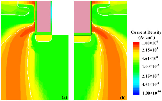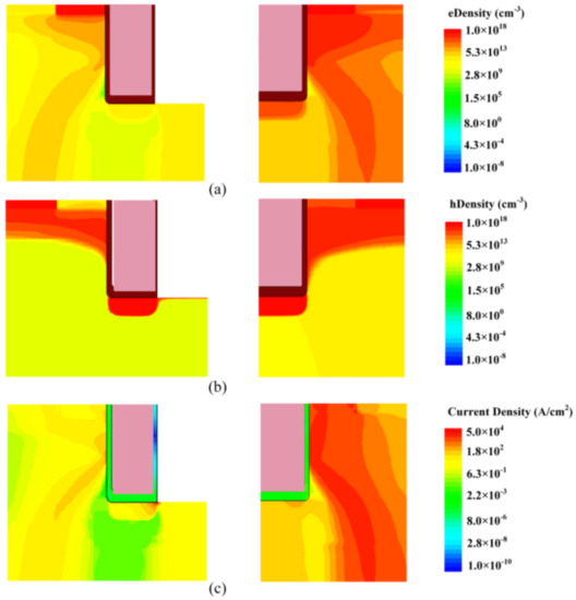 Although the gate channel is turned off after 15 μs, the C-TMOS is out of control afterwards, while the FS-TMOS survives. During this process, the junction temperature is high enough to make minor carrier increase exponentially, which results in a current path between drain and source terminal. If the dissipated power exceeds the power moving away from device, the temperature continues to increase, leading to device failure. The electron and hole distribution and formed current of FS- and C-TMOS at the time point T2 are shown in Figure 10.