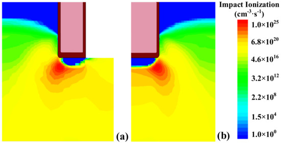 Although an SBD is merged in the fin-shape trench gate, the maximum avalanche energy (Eav) and the maximum temperature during this process are almost the same for the FS- and C-TMOS. The impact ionization distributions of FS- and C-TMOS at the time point T3 are also verified by the results, as shown in Figure 12. In other words, the integrated Schottky diode between the FS gate does not degrade the avalanche capability. It is suggested that the avalanche failure of the two devices tends to be the same.
