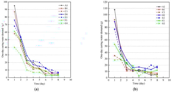 Figure 2 presents the change in 1-day curing water demand of cover concrete with curing age for the different mineral admixtures and dosages with water–binder ratios fixed at 0.35 and 0.45. As can be seen from the law of curing water demand in the figure, in the case of different water–cement ratios and mineral admixtures, the behavior of 1-day curing water demand are similar with the increase of curing age. From the results, it can be observed that the curing age of 1 day has the highest curing water demand. With the increase of curing age, the water absorption rate is fast in the first 3 days, and the curing water demand remains stable after 7 days.
