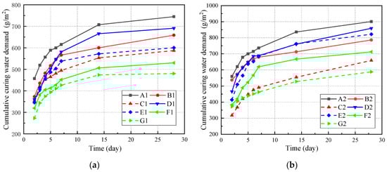 It can be seen from the comparison between Figure 3a,b that the water–binder ratio is increasing, and the specific cumulative curing water demand of cover concrete is also growing. At the curing age of 28 days, the cumulative curing water demand of A2 is 901 g/m2, which is 1.2 times that of A1. Compared with pure cement, the addition of the fly ash and GGBS can reduce the cumulative curing water demand of the composition cementing material system and with the increase of mineral admixtures dosage, the cumulative curing water demand decreases significantly. When only considering the influence of components in the cementing material system on water absorption without considering environmental factors, the range of cumulative curing water demand for pure cement, fly ash, GGBS and a mixed FA and GGBS cementing material system is 745 ~900 g/m2, 660~786 g/m2, 691~860 g/m2 and 530~712 g/m2, respectively. The influence of mineral admixtures on the total water demand is as follows: pure cement > GGBS > fly ash > mix FA and GGBS.