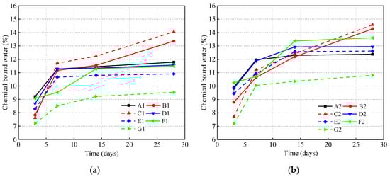 Influence of mineral admixtures on chemically bound water content. (a) 0.35; (b) 0.45.