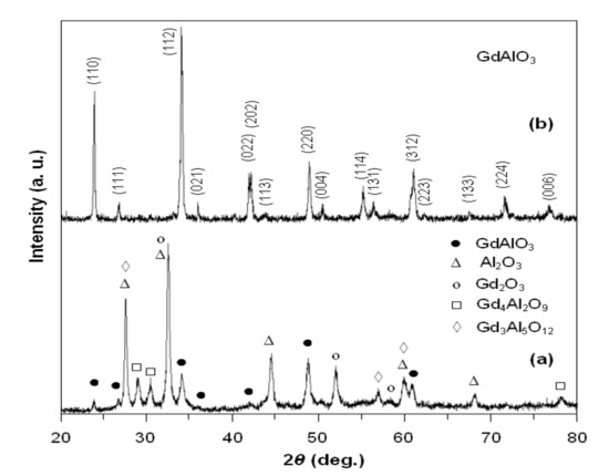 According to the PDF card No. 46–395, the gadolinium aluminate obtained exhibits an orthorhombic symmetry (Pbnm space group).
