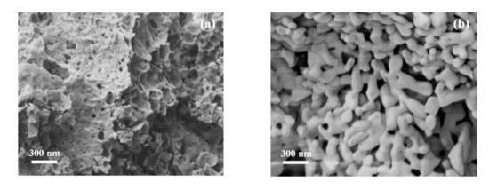 The grain sizes determined through the linear intercept method have an average value between 70 and 100 nm. A structure with accentuated porosity can be observed, in which open pores predominate, forming channels that facilitate the adsorption and desorption of vapors (Figure 4b).