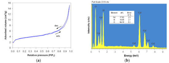 N2 adsorption/desorption isotherms (a) and EDX spectrum with the analyzed elements (b) for gadolinium aluminate powder, heat treated at 1000 °C for 7 h.