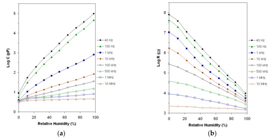 In Figure 6a,b, the log C and log R, respectively, vs. RH characteristics are shown at room temperature (25 °C) for the frequency range of 40 Hz–10 MHz. The characteristics exhibit good linearity in logarithmic scale for all working frequencies and their slope decreases with the increase in the working frequency.