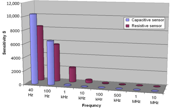 In Figure 7, the sensitivity for both sensor regimes, capacitive and resistive, for eight working frequencies in the range 0–98% RH is shown. Regarding the capacitive sensor, the highest value of sensitivity, around 10,000, is reached for the working frequency of 40 Hz and decreases significantly to the value of 125 for the working frequency of 1 kHz. Regarding the resistive sensor, the highest value of sensitivity, around 8000, a slightly lower value than in the case of the capacitive sensor, is obtained at a frequency of 40 Hz and decreases exponentially to the value of 0.6 for the frequency of 10 MHz.