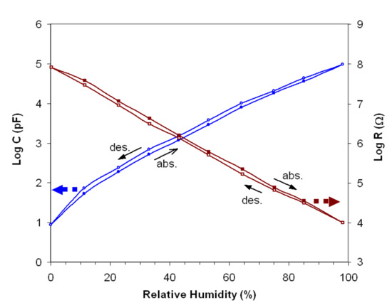 The maximum difference between the RH values at absorption/desorption for the same value of capacity or resistance was defined as hysteresis. In the practice of sensor applications, this value must be as low as possible.