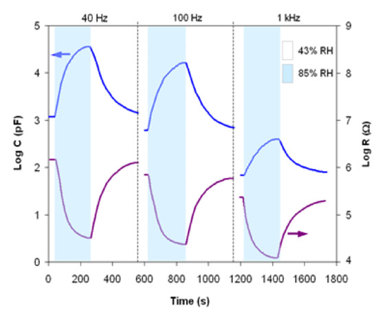 The Log C and Log R vs. RH characteristics of the sensor show good linearity at all working frequencies. The sensor shows a small hysteresis (<3%) and a response time of around 180 s.