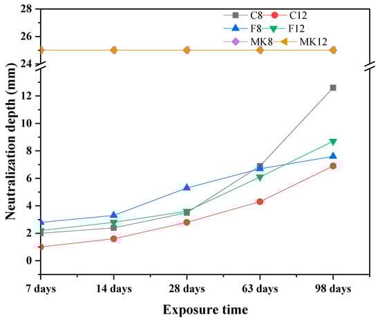 The neutralization depth variation of all GPC specimens with the increase of exposure time is displayed in Figure 4. The specimens marked with MK-8 and MK-12 were penetrated entirely by sulfuric acid at the immersion time of 7 days. This phenomenon, however, did not appear in the fly ash-based GPC specimens. This indicates that metakaolin-based GPC has a poor resistance to the acid penetration, which is consistent with the results in Figure 2. For fly ash-based GPC specimens, their neutralization depths increased with the growth of exposure time. During the first 28 days of immersion, the neutralization depths of specimens prepared with low-calcium fly ash which, is marked as F, were higher than others. After 28 days, neutralization depth of the high-calcium fly ash-based GPC specimen (C-8) dramatically increased. However, the specimen C-12 showed a slow growth depth for the neutralization depth. The neutralization depth of C-12 specimen exposed in acid solution for 98 days was only 6.9 mm, which is the minimum value. Therefore, in the light of the results of neutralization depth, the high-calcium fly ash-based GPC showed the best sulfuric acid corrosion resistance, which suggests that the increase in the Ca-content of GPC results in a higher susceptibility to the attack of sulfuric acid [31,32].