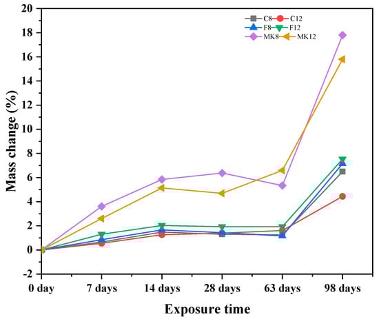 Figure 2 shows the visual appearance variation of GPC specimens when exposed in sulfuric acid solution for 0 day, 49 days, and 98 days. The surfaces of all GPC specimens were smooth and flat before the specimens were immersed in the acid solutions. With the increase of exposure time, the damage of specimens became increasingly serious. After 49 days of immersion, the specimens of F-8 and F-12 were almost intact, and minor damage appeared in specimens C-8 and C-12. Macroscopic observations of Mk-8 and MK-12 showed that their structures were visibly loose, and some cracks appeared on the surface and some aggregates were bared, as shown in Figure 2. When the exposure time was up to 98 days, all specimens suffered from varying degrees of damage. The surface of specimens marked with C-8, F-8, and F-12 were rougher due to the spalling of mortar matrix and aggregates, while the MK-8 and MK-12 specimens failed after 98 days of acid corrosion. The observed structure of sample C-12 was intact and dense, in which only a little mortar split away from the surface of the specimen. As it is shown in Figure 2, the structure of metakaolin-based GPC was unconsolidated and showed poorer acid resistance than the fly ash-based ones when they possessed the same mix proportions. On the contrary, the high-calcium fly ash-based GPC activated by a high concentration of alkali showed good acid resistance.