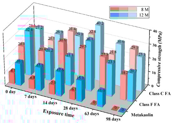 Figure 6 reveals the evolution of compressive strength for GPC before and after exposure to the sulfuric acid solution. Initially, the compressive strengths of GPC alkali-activated by high concentration of alkaline liquor mixture (Na2SiO3 and 12 M of NaOH) were greater than that of low concentration (Na2SiO3 and 8 M of NaOH). It is attributed to the fact that the formation of geopolymeric gel depends on the concentration of alkali OH ion, but low NaOH concentration weakens the chemical reaction and reduces the compressive strength of GPC [33,34]. In addition, the compressive strength of metakaolin-based GPC specimens is too low to meet the practical engineering application, which is owing to the alkaline solution failing to promote the geopolymerization reaction thoroughly [35,36].