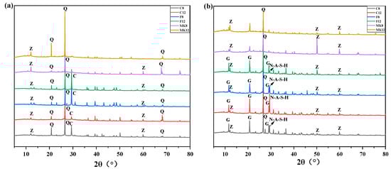 XRD patterns of six kinds of GPC before immersion are revealed in Figure 8a. The characteristic diffraction peaks at approximately 2θ = 20.9°, 26.6°, and 68.1° correspond to the crystal planes of quartz [47]. However, quartz was in an inert phase and generally did not react with acid solution [48]. The diffraction peak belonging to calcite was identified at 2θ = 29.5°, which was formed due to the carbonation reaction in calcium-rich binding binders [49]. Additionally, the phase of gismondite [20] was also found in the XRD spectra. By comparing the XRD patterns of unexposed GPC, the calcite [50] only existed in the matrix of high-calcium fly ash and low-calcium fly ash. It can be attributed to a certain amount of calcium oxide that existed in fly ash.