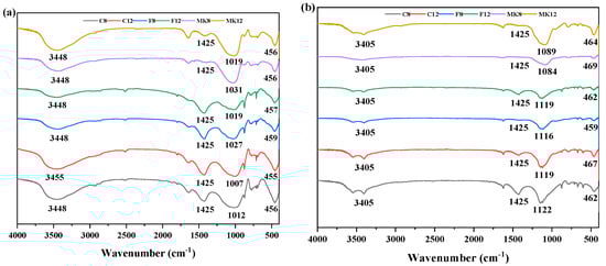 Figure 9 reveals the FT-IR spectra of different GPC specimens immersed in sulfuric acid solution for 0 day and 98 days. Before immersion, the high characteristic absorption peaks at about 3448 cm−1 were correlated to the asymmetric stretching vibration of O–H groups in bound water [54]. It can be attributed to the fact that free water took part in the hydration during the process of geopolymerization and then turned into bound water [55]. The bands detected at 1425 cm−1 are attributed to tensile vibration of O–C–O bond due to the carbonation reaction [56]. This is because the geopolymer produced by NaOH activator readily absorbed CO2 from the atmosphere to form carbonates [55]. The geopolymerization of metakaolin -ased GPC was incomplete, resulting in an excessive amount of alkali, which is more favorable for the production of carbonates. The strongest vibration at 1007–1031 cm−1 is attributed to the asymmetric stretching and bending vibration of the Si–O–Si and the Al–O–Si bonds [57]. After the exposure of sulfuric acid solution, the FT-IR spectra of GPC exhibited significant changes compared with the unexposed specimens. The water component at 3448 cm−1 changed to 3405 cm−1, which was caused by the presence of gypsum [21]. After sulfuric acid attack, the vibration band at 1007–1031 cm−1 shifted to higher wavenumbers (1084–1122 cm−1). This may be attributed to the dealumination occurring in the formed gel when exposed to the acid environment [58], contributing to the decrease of intensity. Moreover, with the increase of exposure time, the vibrational bands narrowed and the area shrunk as well. However, the peak of high-calcium fly ash was still supreme. Therefore, high-calcium fly ash-based GPC suffering the corrosion of sulfuric acid solution can retain the good crystallinity of N-A-S-H gel and high residual strength.