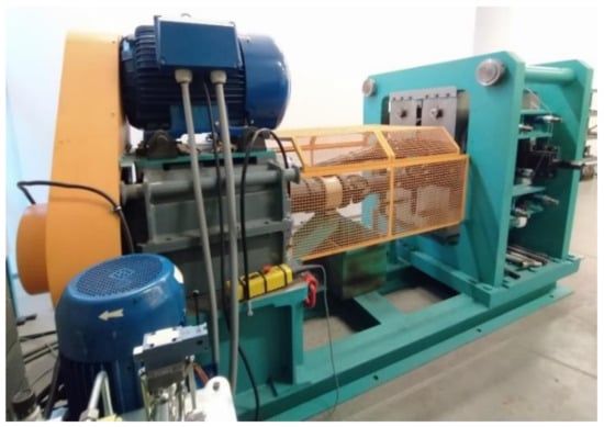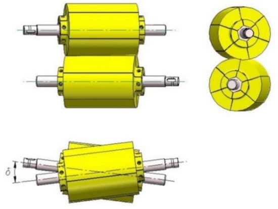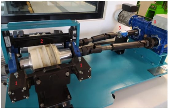 Figure 6). The first one is the drive unit consisting of two worm reducers and an electric motor. The applied drive makes it possible to obtain the rotational speed of rolls equal to 15 revolutions per minute. The next mechanical unit is the transmission unit with an applied sensor for measuring the torque occurring on the rolling roll, which measures the torque during the plastic forming of the product. The largest component of the rolling stands is the rolling stand assembly. The rolling stand of the model rolling machine consists of two rollers, which have the possibility of changing the angle of twist between their axes in the range of −6 to 6°. In addition, two ways are used which have the ability to adjust the distance from the axis of rotation of the workpiece. The tools used in the model rolling mill are made from two parts printed on a 3D printer.