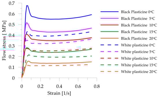 55]. The laboratory test was carried out according to the PN-57/H 04320 standard with the use of an INSTRON 3369 testing machine (Instron, Norwood, MA, USA) with Teflon spacers, for five temperatures: 0 °C, 5 °C, 10 °C, 15 °C and 20 °C. The tests were carried out at three different strain rates. Based on the results obtained, plastometric equations were developed to describe the behavior of commercial white and black plasticine. A constitutive equation was developed that is a function of strain, strain rate and forming temperature. Plastometric Equation (2) presents the equation describing the plasticine, while