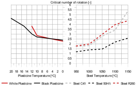 Table 2. It was observed that the white plasticine obtained lower values than the black plasticine, and an increase in temperature also caused an increase in the fracture criterion values. A comparison with hot-formed C45 steel is also presented, where the similarity of results to the values obtained for formed steel was observed.