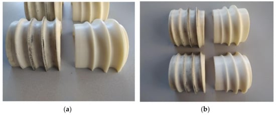 Figure 9a shows the differences between the two sets of tools. The tools used for skew ball rolling were made of ABS plastic. The geometry of the tools was made by 3D printing, which is based on the FDM printing system. FDM printing involves applying thin layers of molten material to form the geometry of the tool. The printing was done using a 3D uPrintSE machine from Stratasys (Rehovot, Israel).