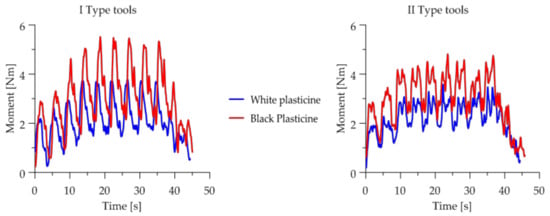 The maximum torque obtained with the first type of tool was approximately 3.95 Nm for white plasticine and 5.8 Nm for black plasticine, while the values obtained with the second type of tool were lower: approximately 3.4 Nm for white plasticine and 4.5 Nm for black plasticine, respectively.