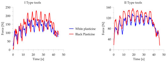 The maximum force recorded during rolling with the first type of tools is on average equal to: white plasticine—184.9 N; black plasticine—approx. 230 N. On the other hand, the forces recorded during rolling with type two tools are about 135 N for white plasticine and about 150 N for black plasticine, respectively.