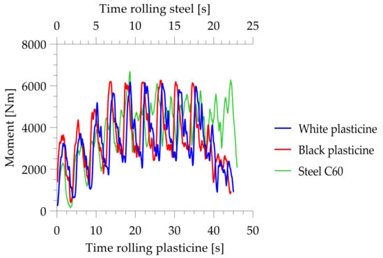 Based on the results obtained from the skew rolling process and the real process, estimates of the torque values during rolling were calculated. Then, the estimated results obtained from the physical modelling were compared and contrasted with the results obtained from the real process. The calculations were carried out according to Equation (4) [