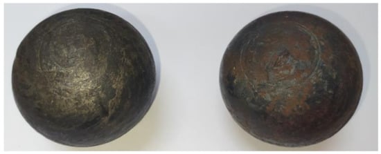 On the surface of the balls, the roughness of the spherical surface and a groove on the circumference of the balls were observed. In addition, material build-up residues were observed on the polar surfaces of the balls, which are the result of the material remaining from the bridge connecting the balls being rolled out. In the case of the surface quality of the balls obtained, a similarity was observed between the results of model tests using plasticine and the real process of hot rolling steel balls at 1050 °C.