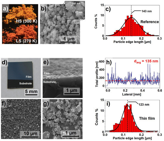 (a) Fe(pz)[Pt(CN)4] in the high spin (HS) and low spin (LS) states; (b) scanning electron microscope image of nanocrystals; (c) particle size histogram based on the dimensions calculated from SEM images; (d) macroscopic photograph of the prepared thin film; (e) SEM cross-section of the thin film; (f,g) SEM images of the surface of the thin film; (h) results of profilometry measurement performed on the thin film; (i) particle size histogram of the thin film particle size distribution.