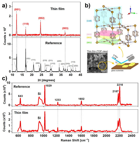 (a) X-ray diffraction pattern of the reference and thin film samples indexed to the respective Miller planes; (b) position of major Miller planes of Fe(pz)[Pt(CN)4] and visualization of the effect of texture on the diffraction patterns; (c) comparison of wide range Raman spectra of the reference sample and thin film.