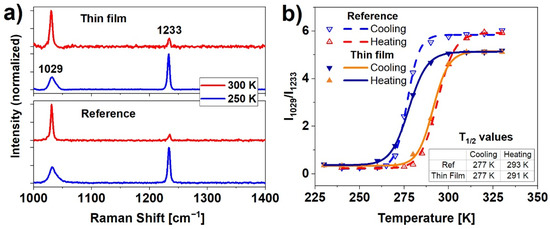 (a) Comparison of HS (300 K) and LS (250 K) Raman spectra of the reference sample and thin film; (b) hysteresis of the ratio of the intensities of the 1029 to 1233 cm−1 bands for the reference sample and the thin film obtained from temperature-dependent Raman measurements.