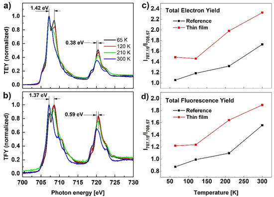 XAS in TEY (a,c) and TFY modes (b,d) for the reference and MAPLE-deposited samples measured at two temperatures, 300 K and 65 K.