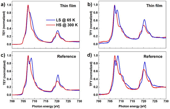 Figure 6 shows XAS for both TEY and TFY detection modes and for both reference and MAPLE-deposited samples measured at two temperatures, 300 K and 65 K. Comparing the results obtained for the reference sample where the SCO layer thickness is in the range of a few tens of micrometers to the MAPLE-deposited sample, where the average thickness of the film is estimated as 135 nm, the relative intensity of the peak at 708.57 eV, characteristic for LS, to the peak at 707.15 eV, characteristic for HS, is significantly smaller in case of the thinner film. This result can be again related to the SOXIESST effect that is more evident in the case of the thinner film. Similar results, confirming that the SOXIESST phenomenon has less influence in the case of powder samples, have been reported by other authors [30]. Probably the SCO nanocrystals in the thick layer of the reference sample are sparsely distributed, so that the actual intensity of the X-ray beam incident on the SCO complex is weaker than the nominal value, while in the case of a MAPLE-deposited layer, the nanocrystals form a thin film on the substrate surface.