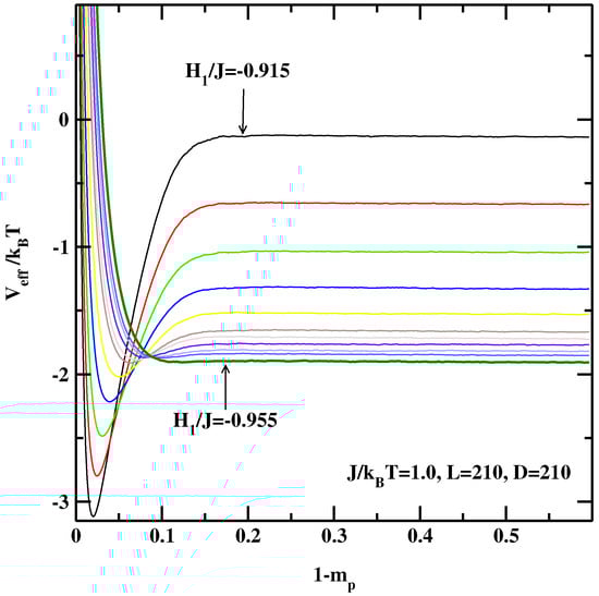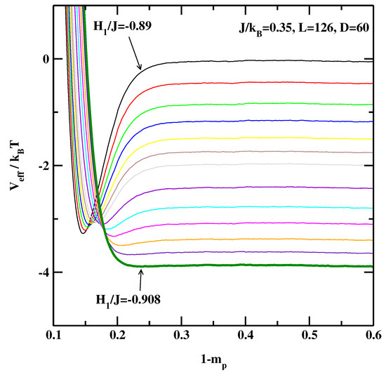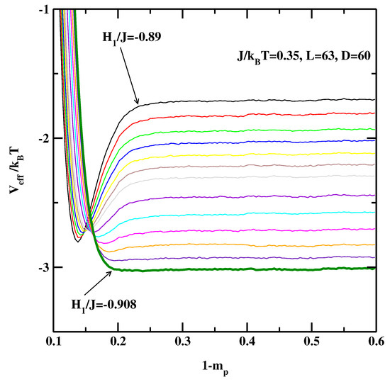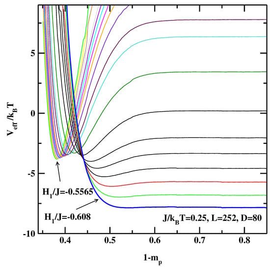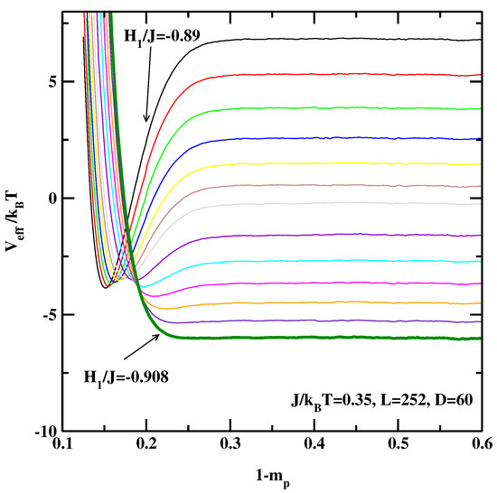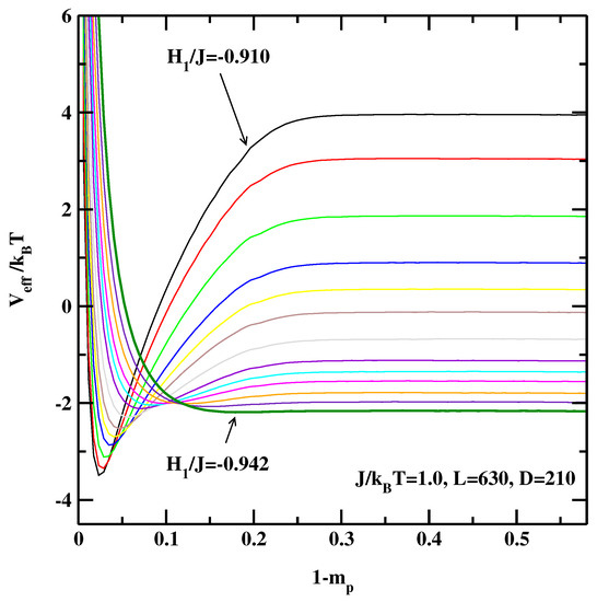 where denotes the range of interest, . We considered the non-symmetric system with . Following [21,22] we split the calculations of the order parameter distribution in windows and applied the successive sampling technique but with windows on rather than on m. Since we used hyper-parallel tempering two or three windows were deemed sufficient. From the order parameter distribution we obtained the effective interaction potential (up to a constant) via