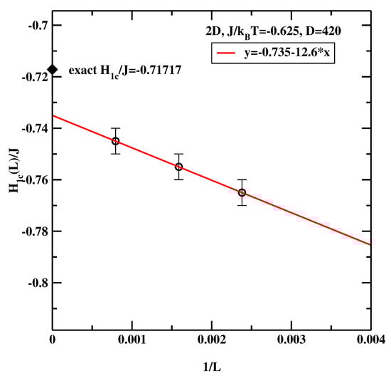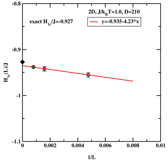 Figure 4 shows extrapolation of the critical surface field to the thermodynamic limit . We note, that the simulational value of agrees very well with the exact result, −0.927. Another important observation is that the critical surface field depends quite visibly on L, indicating that finite size corrections are important. This is in line with theoretical predictions of 2D critical wetting [4], i.e., the interfacial fluctuations in 2D renormalize the temperature (or alternatively the critical surface field) of the critical wetting transition.