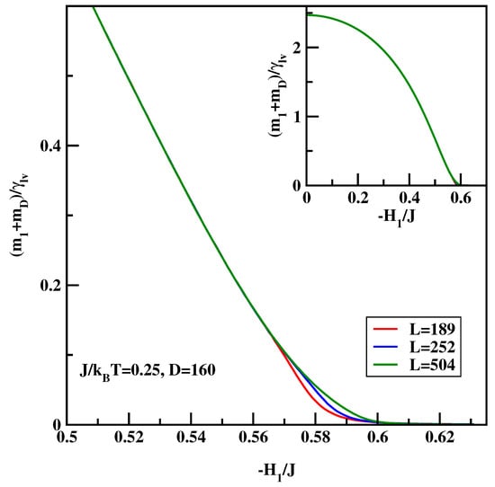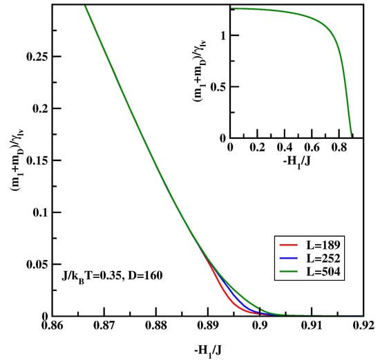 The integrand of Equation (16) vs. the surface field for and for three system sizes L listed in Figure. The inset shows zoom-out of the main Figure.