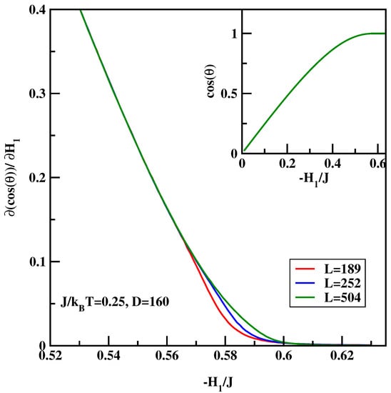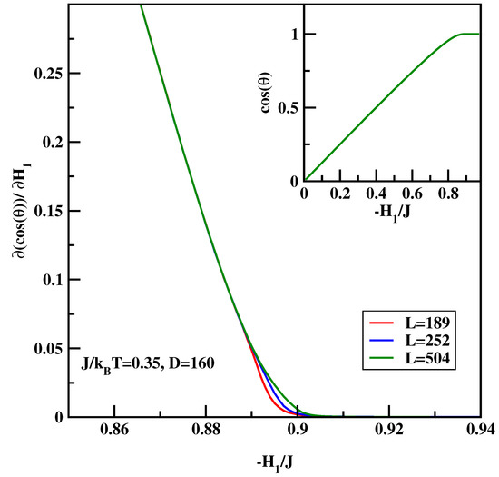 The calculational procedure consists of a series of calculations for the anti-symmetric systems with varying surface field with . We carried out calculations for and 0.35. The integrand of the right-hand-side of Equation (16) depends quite strongly on the system size close to the critical surface field, despite the fact that there is no wetting transition in the system. Therefore we carried out calculations for and for surface fields up to , while for the stronger surface fields the calculations were carried out for , 252 and 504. Similar to previous calculations hyper-parallel tempering was used with up to 120 systems simulated at the same time. The averages were accumulated over spin flips per site. Figure 10 and Figure 11 show the sum of the surface magnetizations divided by the surface tension, i.e., the integrand of Equation (16). We see that close to the critical surface field the integrand develops finite-size dependence. The insets of Figure 12 and Figure 13 show the cosine of the contact angle vs. the surface field. We see that the cosine goes to 1 tangentially. However, it is difficult to pinpoint exactly the tangential point. Moreover, the integral depends on the accuracy of the numerical values of the surface tension. Hence we adopt the following strategy. First we calculated numerically the derivative of the cosine of the contact angle with respect to the surface field (cf. main plots of Figure 12 and Figure 13). The derivative should be zero at the critical surface field, . In order arrive at an estimate of we plotted two parallel lines and and constructed tangential lines via finite difference. Extrapolation of these straight lines give satisfying . Finally from the plots of vs. the thermodynamic limit is reached via extrapolation (cf. Figure 14). The final values of the critical surface fields estimated using this method are for , and for .