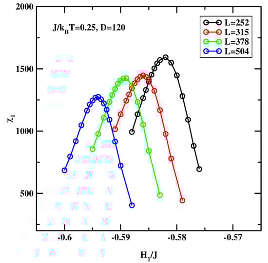 The original idea of Binder, Landau, and coworkers [13,14] (hereinafter referred to as the BLK method) was to consider the symmetric system, . After setting the location of the critical wetting transition can be estimated out by varying at a constant temperature. The maximum of as a function of indicates the location of the critical surface field at which the critical wetting transition occurs. First simulations were carried out for symmetric field at , in order to directly compare with [15]. We assumed that and 126, 252, 315, 378, and 504. The statistical effort was spin flips per site (not counting extra gains due to the preferential sampling technique). A total of 16 systems, each at different were simulated at once using hyper-parallel tempering technique.