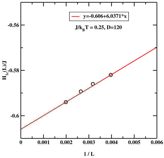 Estimation of from simulational data presented in Figure 15, evaluated at for the symmetric surface fields.