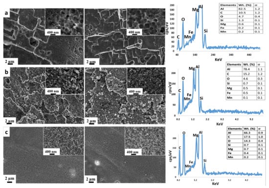 - HNO3/HCl etching: The surface was characterized by a bimodal structure. The coupled action of hydrochloric and nitric acids generated a micro-scale plate-like profile with numerous nano-scale pits (Figure 1a). This morphology is a result of the substrate interaction with this specific acidic solution. It is well known that aluminum alloys react strenuously with hydrochloric acid with a preferential attack of higher energy areas such as dislocations and grain boundaries, usually inducing large, rectangle-shaped pits [74]. However, due to the severe aggressiveness of the solution, the etched areas should be characterized by a non-homogeneous and uniform distribution and size (wider than 1 μm). In such a context, Oh et al. [75] suggested to not use only hydrochloric acid for aluminum etching but a mixture of acidic solution in order to reduce the dissolution rate on the local area and to obtain smaller pits. According to Singh et al. [76], oxidizing acids, such as nitric acid, have less effective corrosive actions on aluminum alloy. The combination of the hydrochloric and nitric acid action can be considered a successful approach to create a hierarchical structure as well as the micro-scale platelet structure that can be seen in the SEM image (Figure 1a).